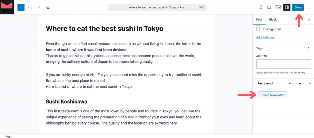 Next, you’ll need to create a post, or even edit an old one. Once finished, save and look for the Instasend box at the bottom of the right sidebar. Click on “Create a Newsletter” and you’ll get a newsletter characterized by the previously chosen template and the selected post instead of the Instasend block.