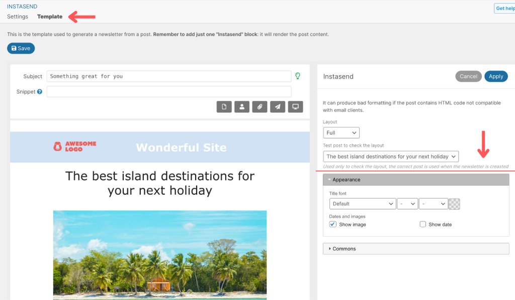 First of all you need to create a template that will be used as structure for your newsletter (Newsletters – Instasend – Template): it is possible to choose header, footer, and eventual colors and fonts, but the most important step id adding the Instasend block.